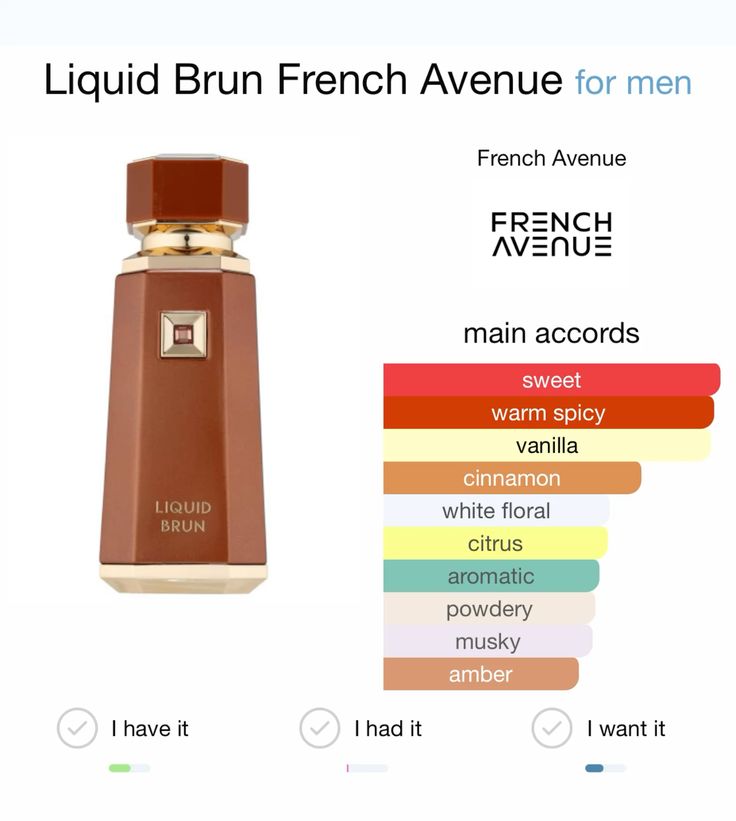 Liquid Brun by French Avenue is a distinguished Eau de Parfum for men. This scent masterfully combines spicy, citrus, and woody notes to create a captivating and sophisticated aroma.